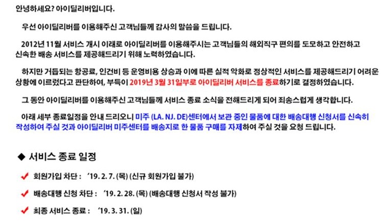 배대지 아이딜리버 서비스가 1월 31일 부로 종료되었습니다.